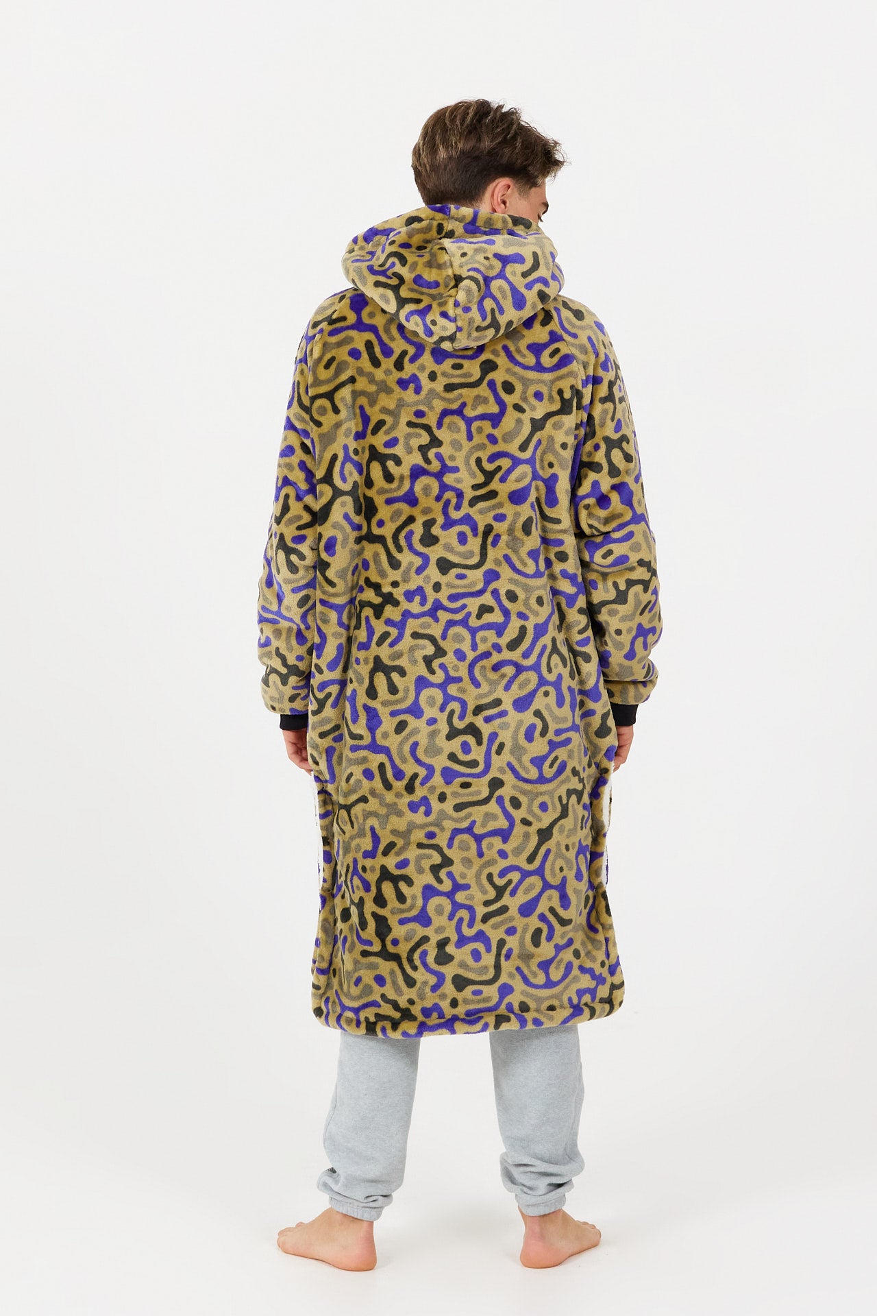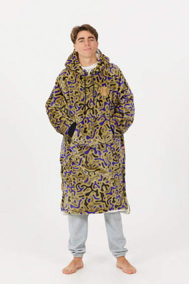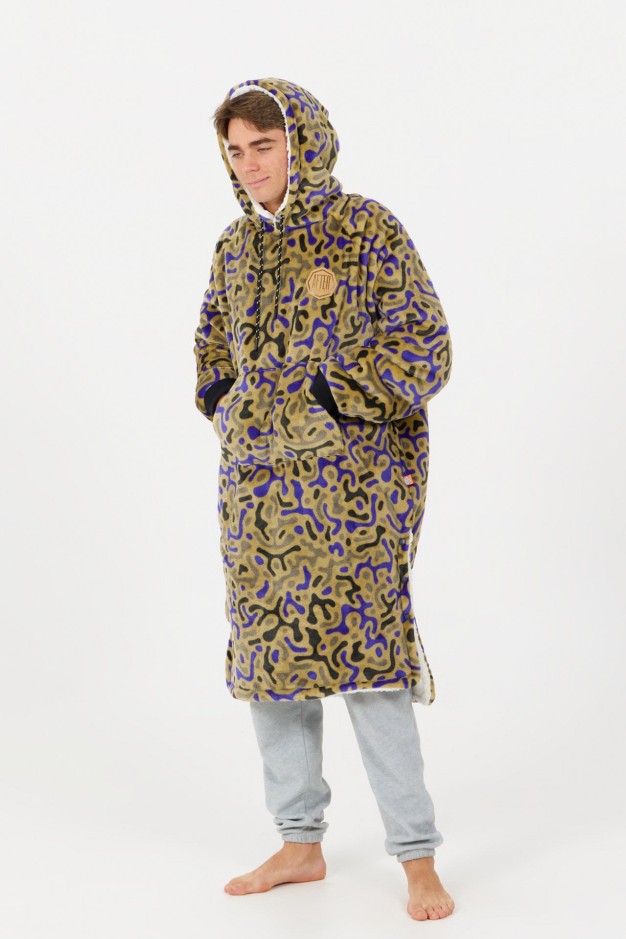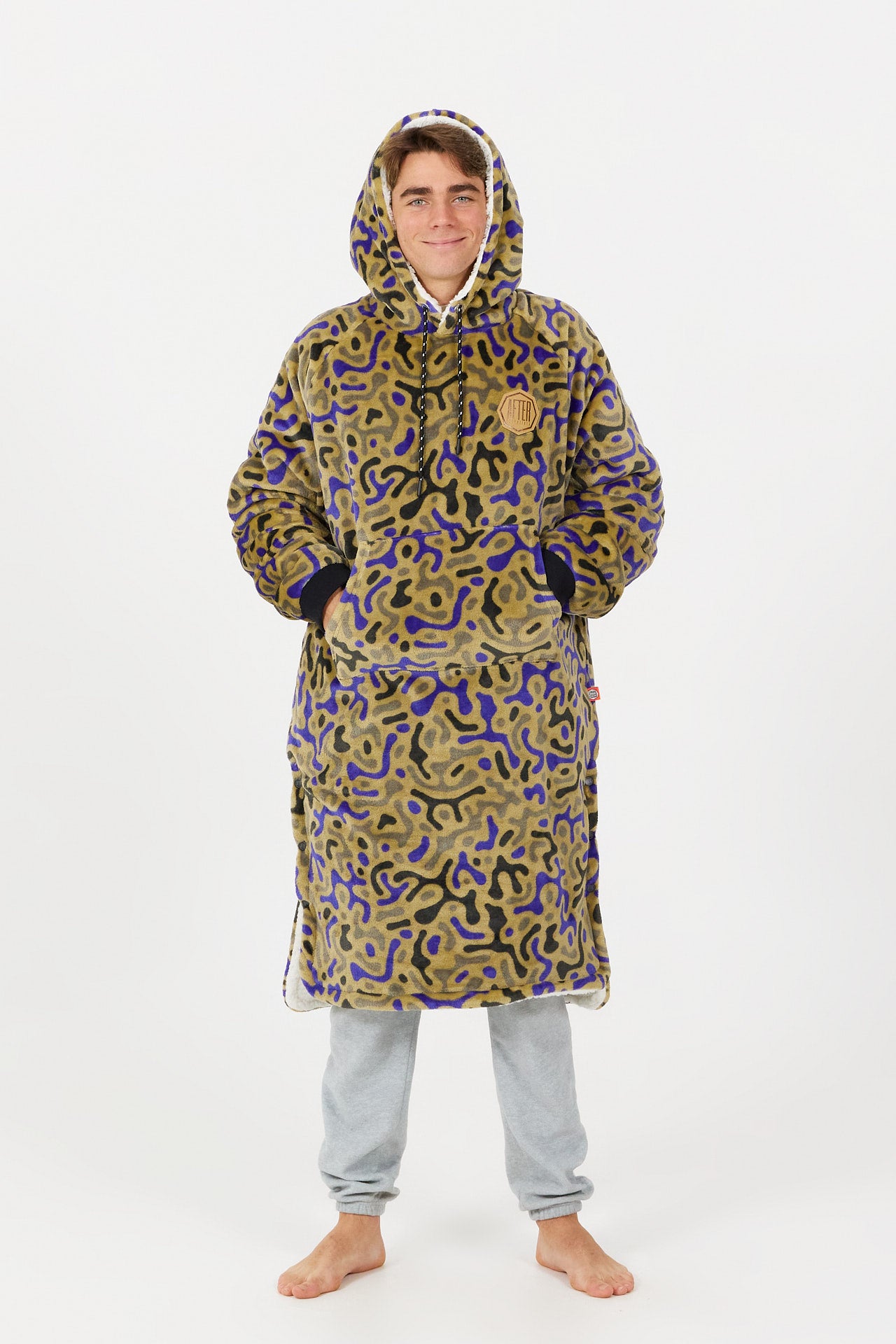 Comfortable and stylish, the Sofa Poncho was designed by the fireside. We wanted to create a garment for relaxing at home after an intense surf or snowboard session. With your hands tucked into the kangaroo pocket, its thick 100% recycled polyester fleece keeps you comfortably warm, while the adjustable hood and wide raglan sleeves offer complete freedom of movement. The side press-studs make it easy to slip on and also allow it to be used as a changing poncho. Perfect for cosy indoor comfort, its sublimated prints and embroidered logo give it a bold outdoor look, ideal for getting changed after a winter surf session or at the end of a day on the ski slopes.